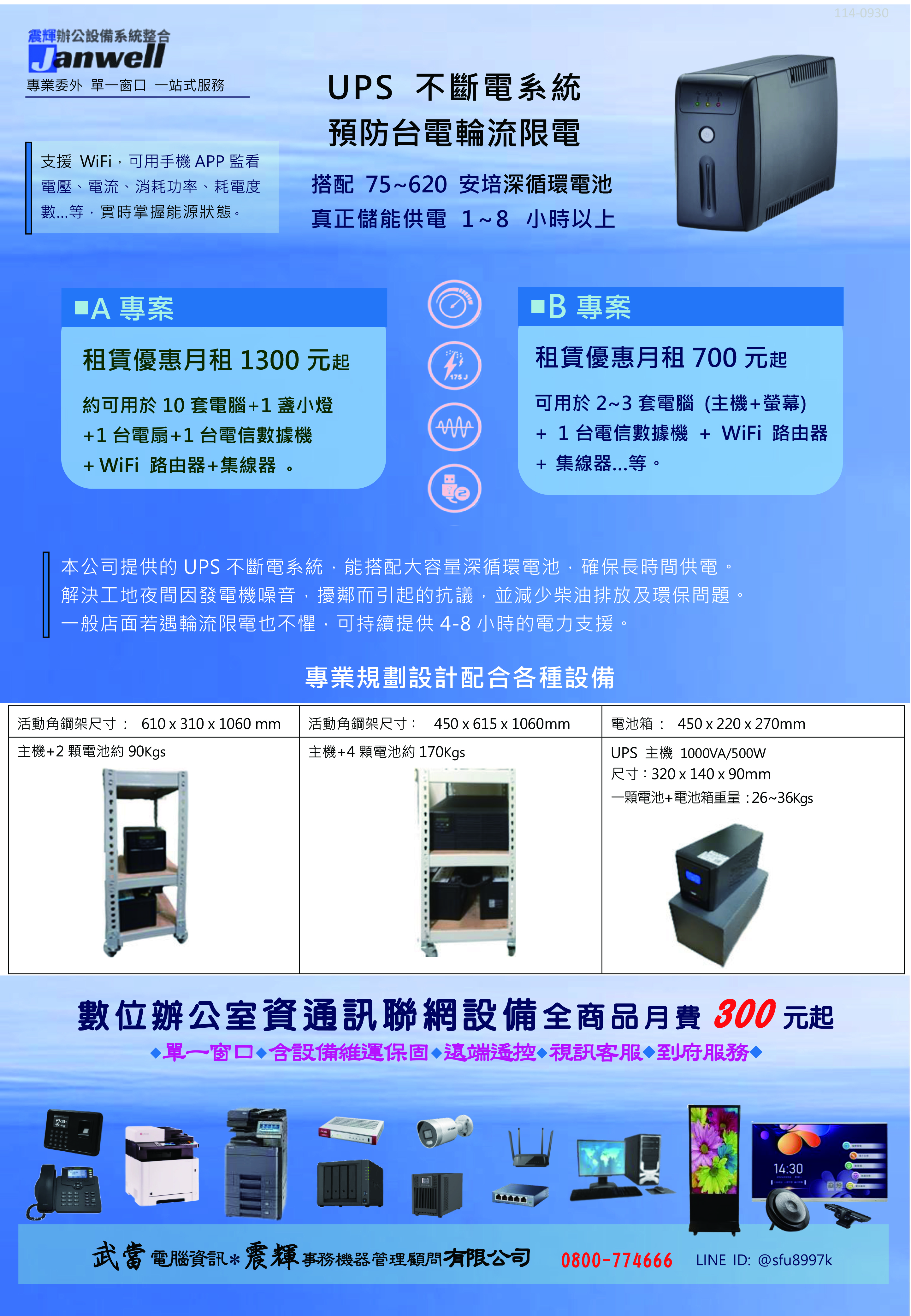 UPS不斷電系統 供電1-8小時以上 月租700元起