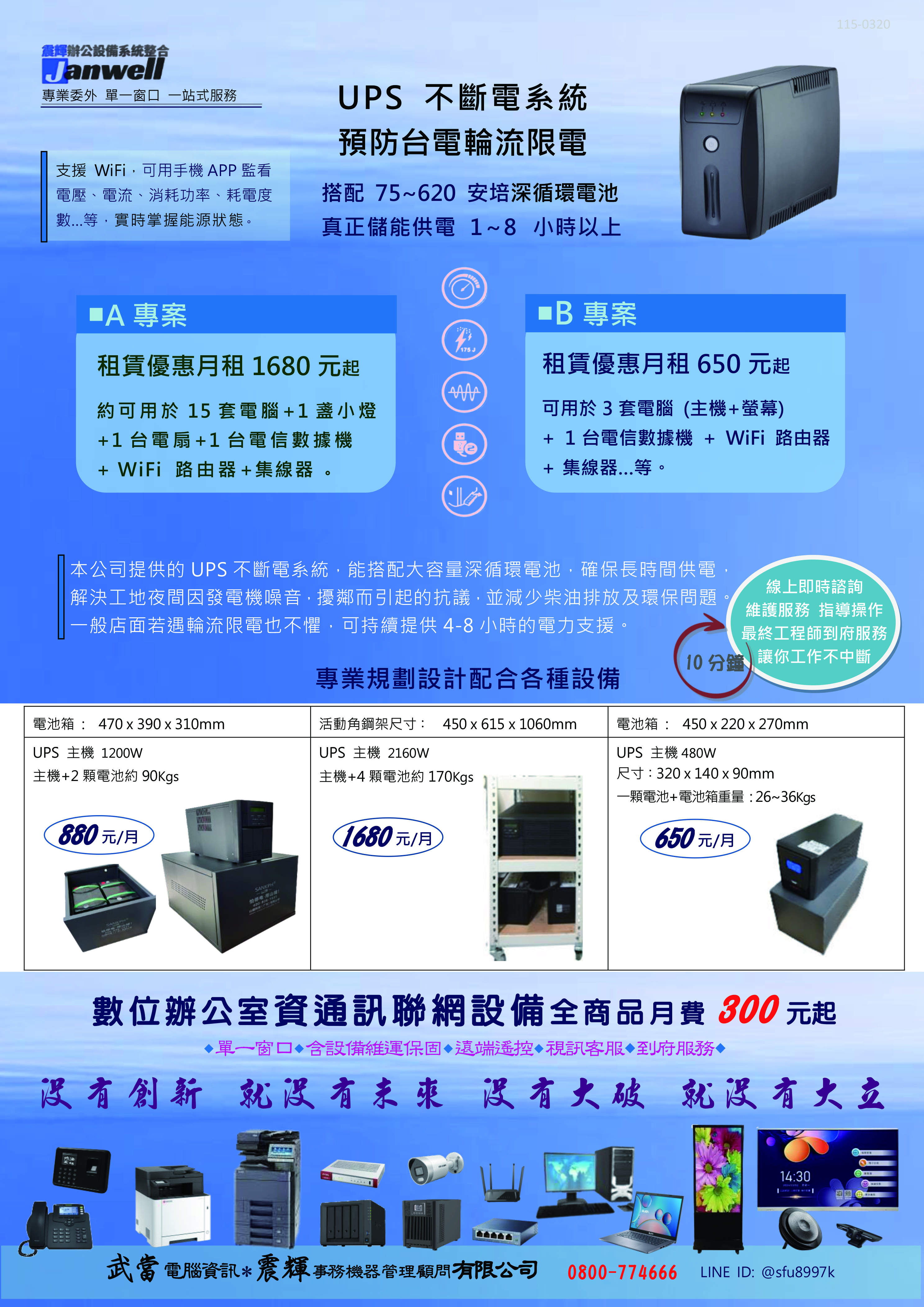 規劃網路設備,儲存設備NAS、監視器、電腦主機、考勤門禁、少數電燈…等,核心資通訊電力設備務必加上長時間放電UPS機種,讓工作24小時365天不中斷。